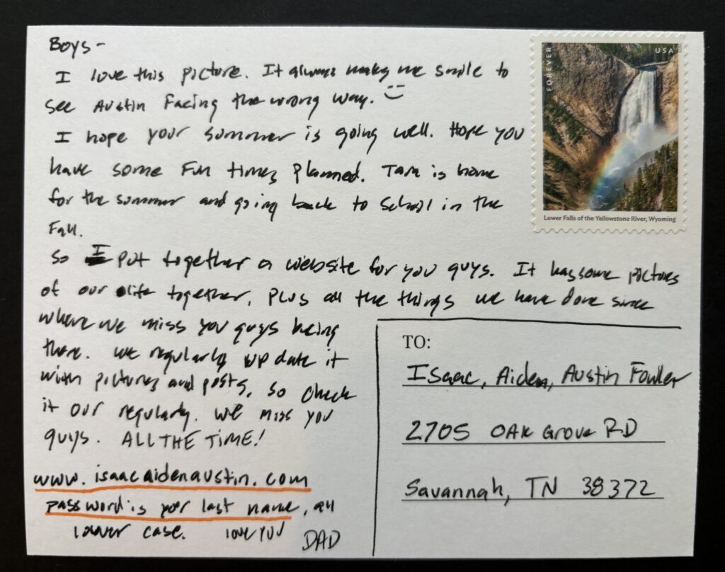 We’ve been thinking about you a lot lately and missing the time that we spent together. We really want you to know how much we love you and hopefully someday we can build a relationship with you. We are going to start sending you postcards to just remind you that we love you and we’re still here.